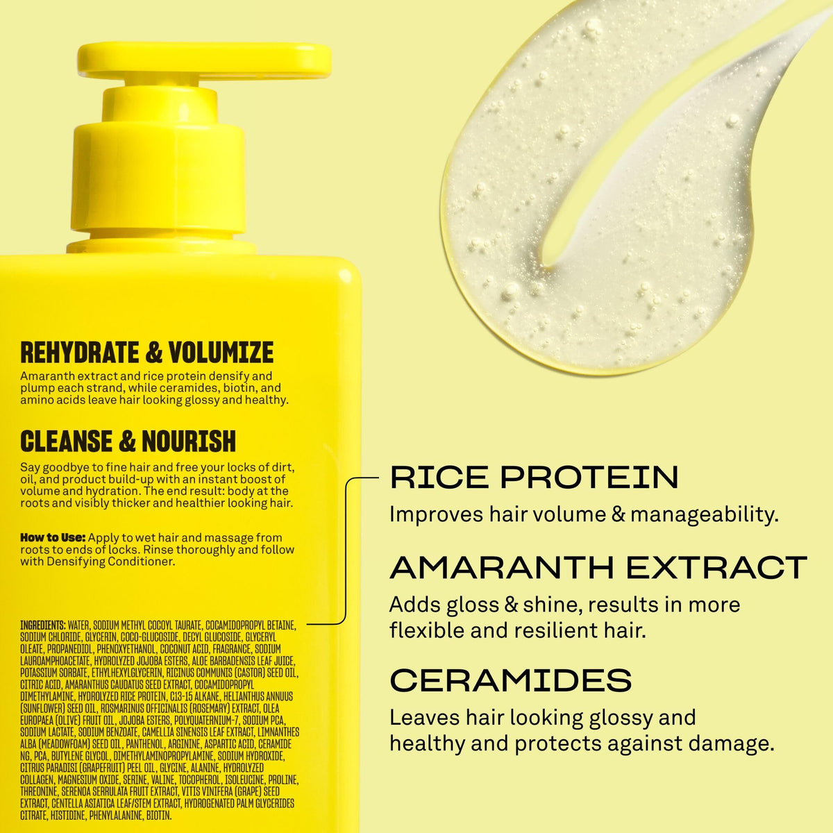 Ingredients: Water, Sodium Methyl Cocoyl Taurate, Cocamidopropyl Betaine, Sodium Chloride, Glycerin, CocoGlucoside, Decyl Glucoside, Glyceryl Oleate, Propanediol, Phenoxyethanol, Coconut Acid, Fragrance, Sodium Lauroamphoacetate, Hydrolyzed Jojoba Esters, Aloe Barbadensis Leaf Juice, Potassium Sorbate, Ethylhexylglycerin, Ricinus Communis Castor Seed Oil, Citric Acid, Amaranthus Caudatus Seed Extract, Cocamidopropyl Dimethylamine, Hydrolyzed Rice Protein, C1315 Alkane, Helianthus Annuus Sunflower Seed Oil, Rosmarinus Officinalis Rosemary Extract, Olea Europaea Olive Fruit Oil, Jojoba Esters, Polyquaternium7, Sodium PCA, Sodium Lactate, Sodium Benzoate, Camellia Sinensis Leaf Extract, Limnanthes Alba Meadowfoam Seed Oil, Panthenol, Arginine, Aspartic Acid, Ceramide NG, PCA, Butylene Glycol, Dimethylaminopropylamine, Sodium Hydroxide, Citrus Paradisi Grapefruit Peel Oil, Glycine, Alanine, Hydrolyzed Collagen, Magnesium Oxide, Serine, Valine, Tocopherol, Isoleucine, Proline, Threonine, Serenoa Serrulata Fruit Extract, Vitis Vinifera Grape Seed Extract, Centella Asiatica LeafStem Extract, Hydrogenated Palm Glycerides Citrate, Histidine, Phenylalanine, Biotin.