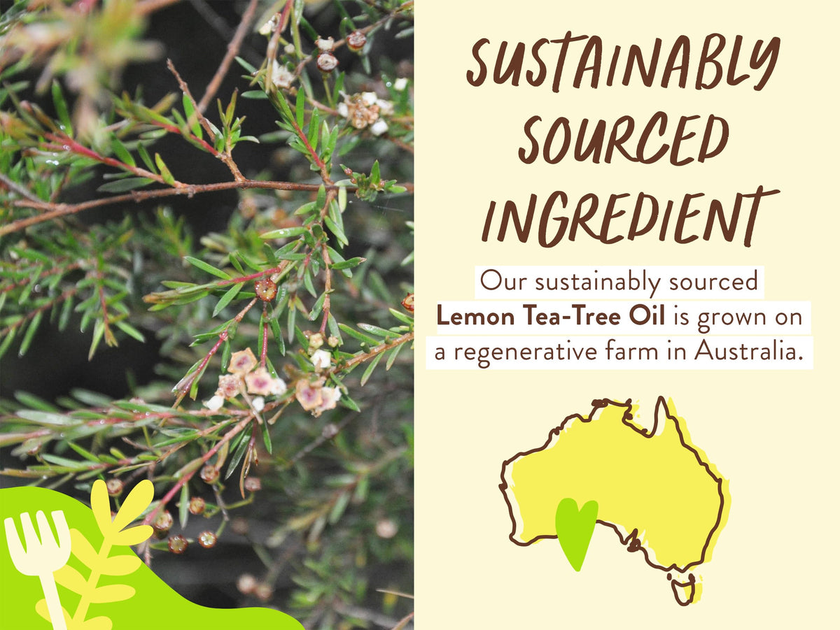 Ingredients: Water Aqua, Sodium Methyl Cocoyl Taurate, Glycerin, Sodium Lauroyl Methyl Isethionate, Leptospermum Petersonii Tea Tree Oil, Citrus Grandis Grapefruit Seed Extract, Botrytis CinereaPassiflora Edulis Fruit ExtractPiceatannol Ferment Lysate Filtrate, Calendula Officinalis Flower Extract, Chamomilla Recutita Matricaria Extract, Nasturtium Officinale Watercress FlowerLeaf Extract, Spiraea Ulmaria Meadowsweet Flower Extract, Melia Azadirachta Leaf Extract, Melia Azadirachta Flower Extract, Tocopheryl Acetate, Propanediol, Sodium Phytate, Cocamidopropyl Betaine, Sodium Methyl Oleoyl Taurate, Citric Acid, Xanthan Gum, CocoGlucoside, Lauryl Glucoside, Sodium Benzoate, Fragrance, Ethylhexylglycerin, Guar Hydroxypropyltrimonium Chloride, Potassium Sorbate. CERTIFIED ORGANIC INGREDIENTS PLANTBASED INGREDIENTS WITH SUSTAINABLY SOURCED LEMONSCENTED TEA TREE OIL We source our tea tree oil from a womanowned regenerative farm. The fragrant citrusy leaves are distilled to extract the precious essential oil, known for its purifying benefits. Powered by renewable energy, the farm repurposes distillation leftovers as a natural fertilizer helping support the ecosystem and local biodiversity.