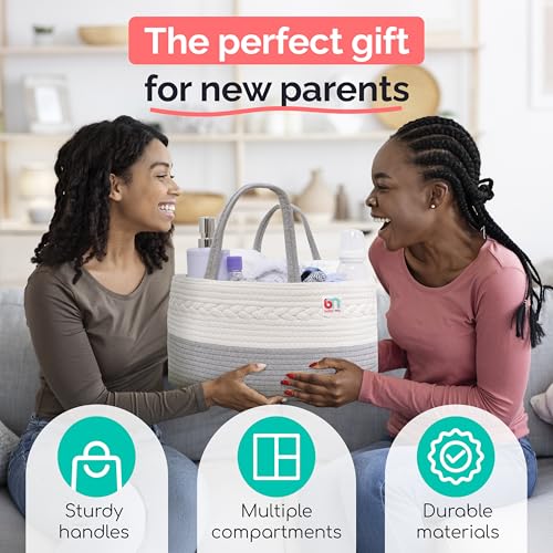 Babynma Rope Diaper Caddy in gray is a spacious and portable organizer for baby and toddler items. This extra-large cotton caddy easily holds diapers, wipes, clothing, and more, making it a practical storage solution for nurseries and bedrooms.