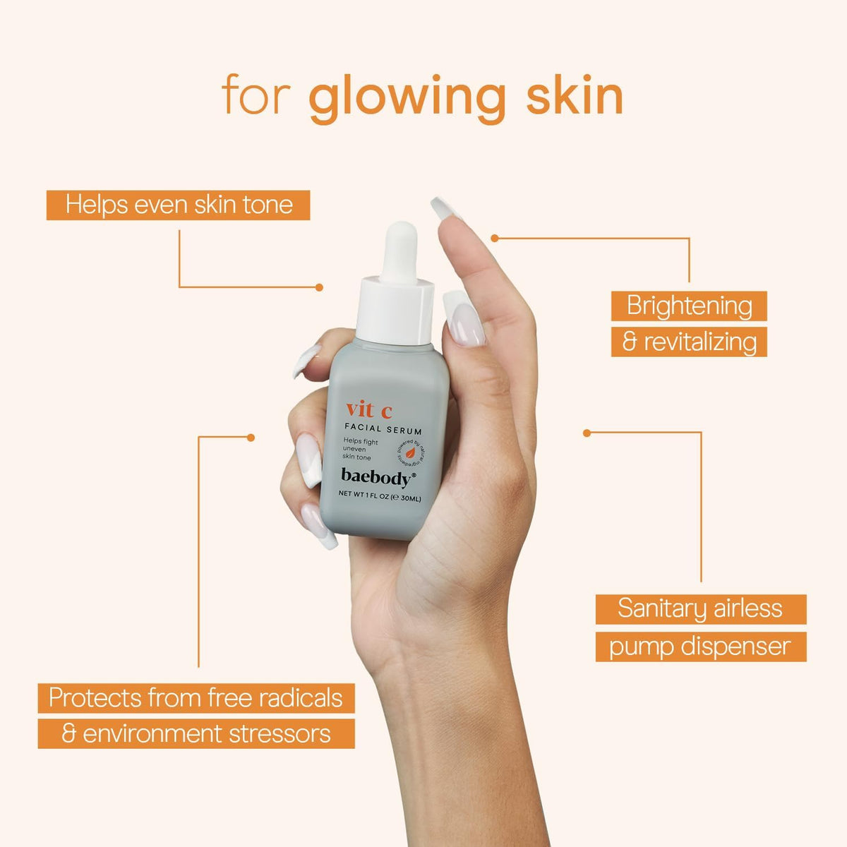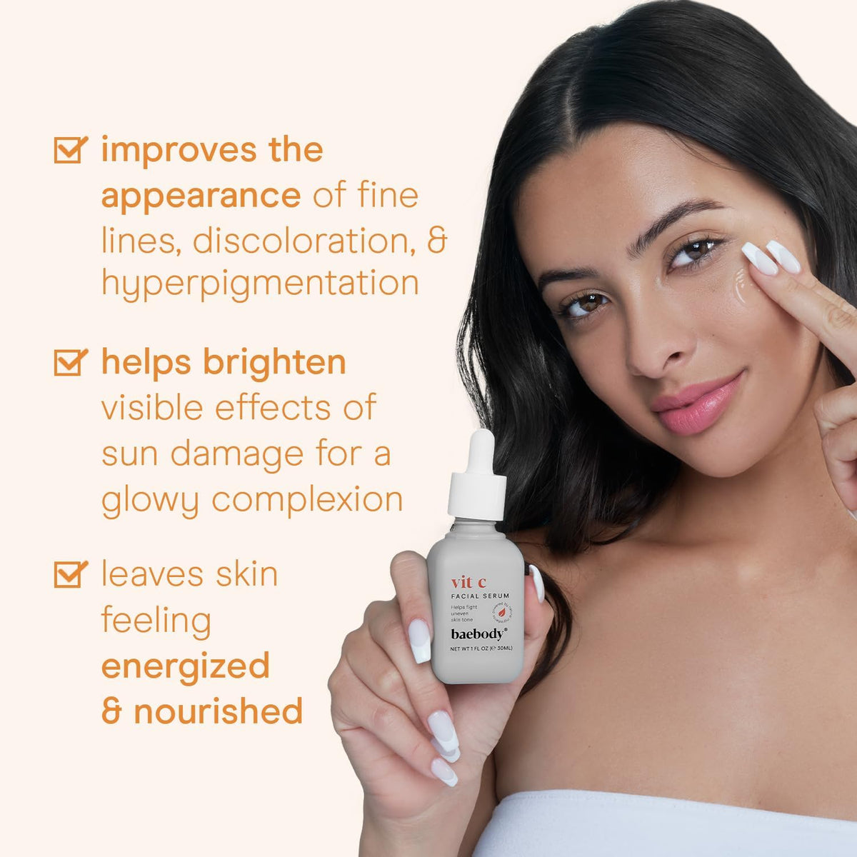 Baebody Vitamin C Face Serum is a USA-made solution for dark spots and dull skin. Infused with hyaluronic acid, this serum rejuvenates and brightens the skin, providing a nourishing treatment that enhances skin radiance and texture.