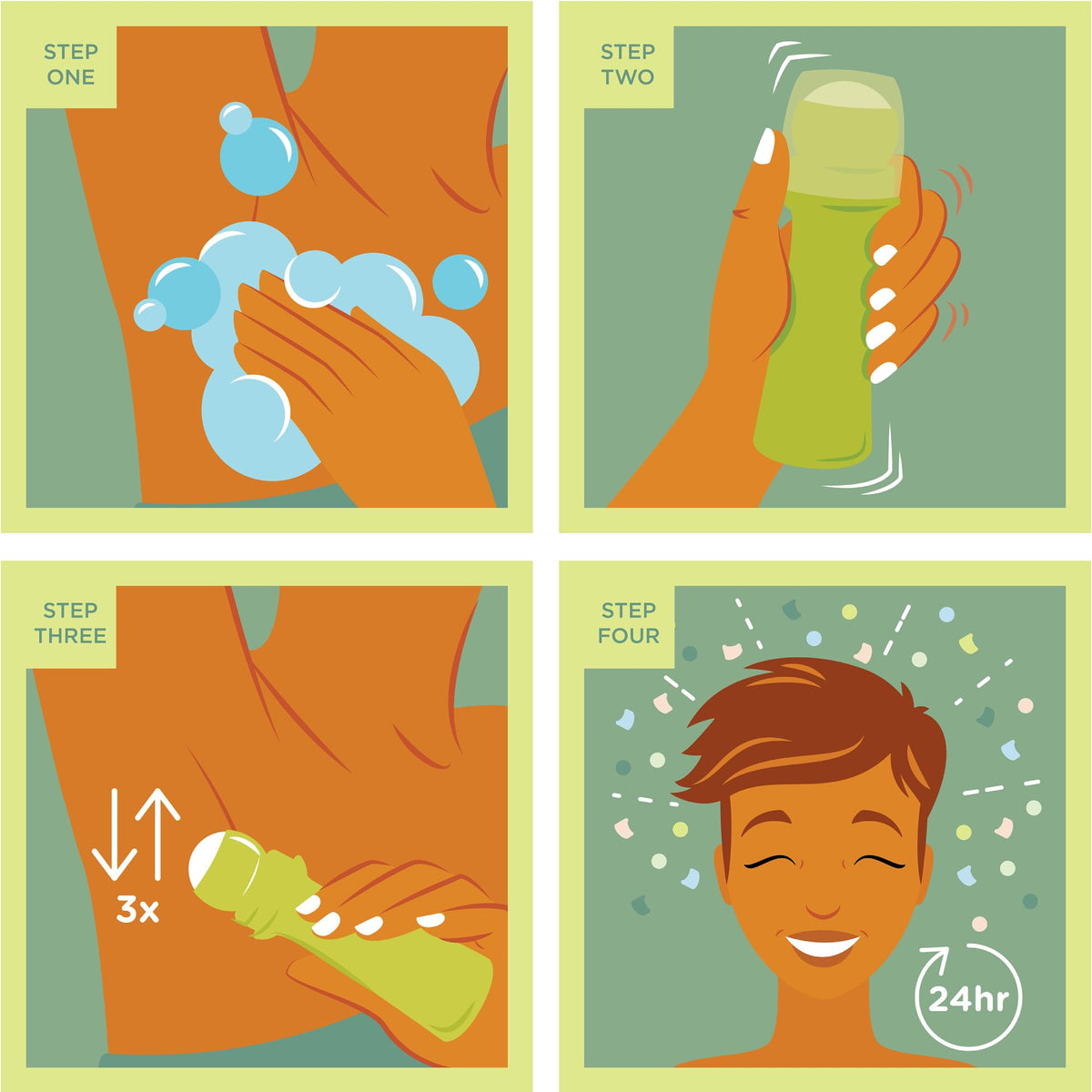 Shake well and apply 34 strokes over the entire underarm area. Allow to dry before getting dressed. Close with cap, and store in a cool, dry area.