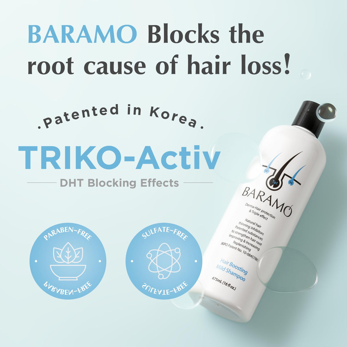 Combat hair thinning and loss with BARAMO Hair Boosting Mild Shampoo. This sulfate and paraben-free formula, enriched with DHT blockers, promotes scalp care, hair regrowth, and strengthens hair for both women and men.