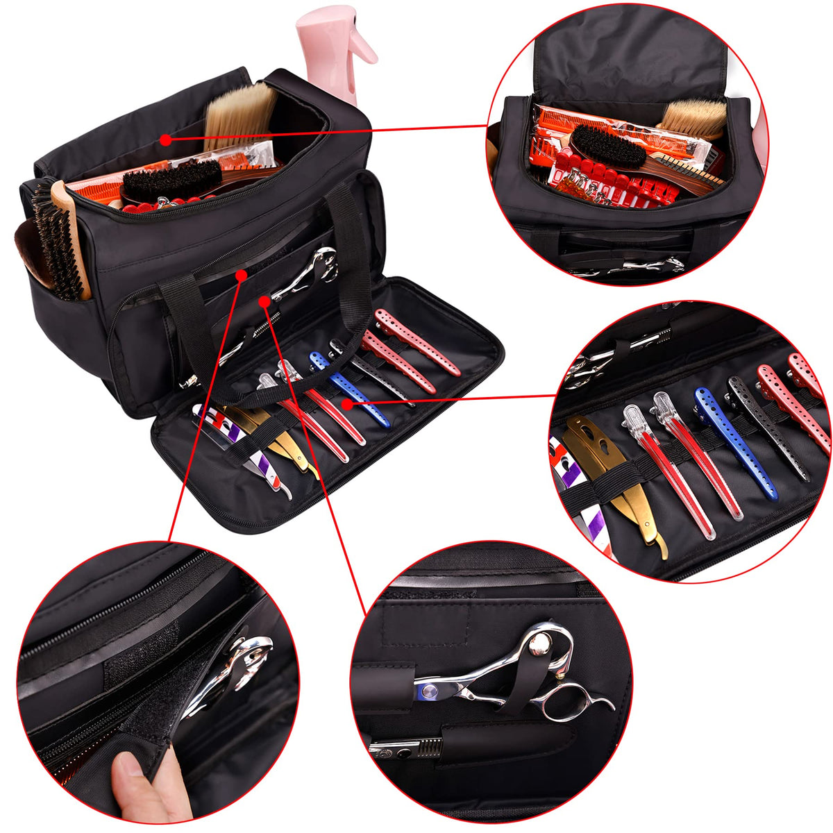 The Barber Hairdressing Bag is a stylish and functional storage solution for salon tools and cosmetics. This portable handbag is designed for hair stylists and beauty artists on the go, offering ample storage space for all essential supplies.