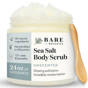Bare Botanics Unscented Body Scrub 24 oz - Naturally Scented Sea Salt Scrub Made in Madison, WI - Formulated w/Skin Loving Moisturizers - Vegan, Cruelty Free Exfoliator w/a Cute Wooden Spoon