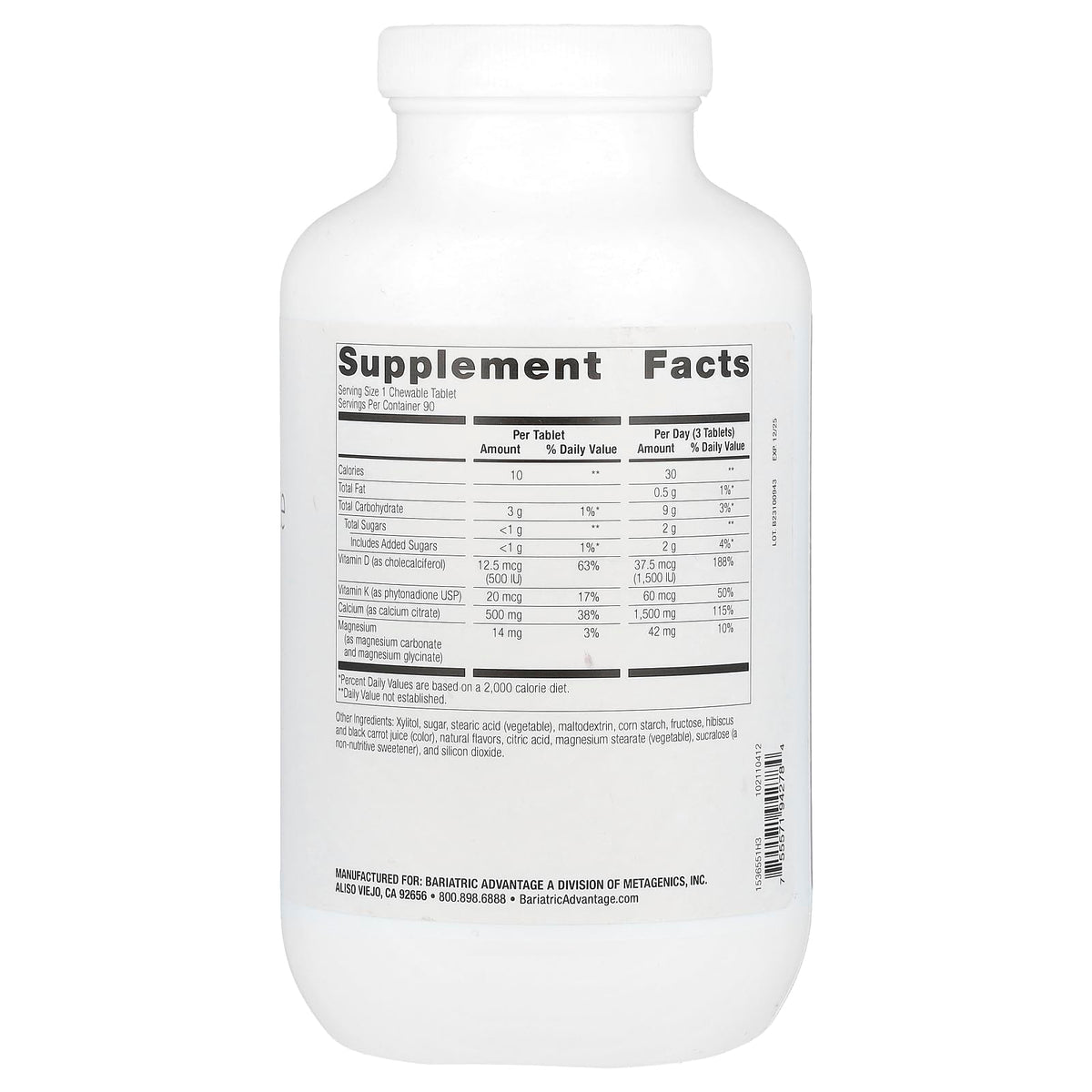 Ingredients :: Calories 5, Total Carbohydrate 2g, Total Sugars <1g, Includes Added Sugars <1g, Vitamin D (as cholecalciferol) 12.5 mcg (500 IU), Vitamin K (as phytonadione USP) 20 mcg, Calcium (as calcium citrate) 500 mcg, Magnesium (as magnesium carbonate, and magnesium glycinate) 14 mg. Other Ingredients: Xylitol, sugar, natural flavors, stearic acid (vegetable), fructose, hibiscus and black, carrot juice (color), citric acid, magnesium stearate , sucralose (a non-nutritive sweetener), , and silicon dioxide.