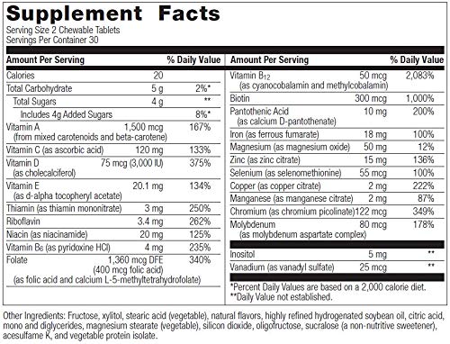 Ingredients :: Fructose, xylitol, stearic acid (vegetable), natural flavors, highly refined hydrogenated soybean oil, citric acid, mono and diglycerides, magnesium stearate (vegetable), silicon dioxide, oligofructose, sucralose (a non-nutritive sweetener), acesulfame K, and vegetable protein isolate, Vitamin A (from mixed carotenoids and beta-carotene) 1,500mcg 167%, Vitamin C (as ascorbic acid) 120mg 133%, Vitamin D (as cholecalciferol) 75mcg (3,000 IU) 375%,, Vitamin E (as d-alpha tocopheryl acetate) 20.1mg 134%, Thiamin (as thiamin mononitrate) 3mg 250%, Riboflavin 3.4mg 262%, Niacin (as niacinamide) 20mg 125%, Vitamin B6 (as pyridoxine HCl) 4mg 235%, Folate 1,360mcg DFE 340%, Vitamin B12 (as cyanocobalamin and methylcobalamin) 2,083%, Biotin 300mcg 1,000%, Pantothenic Acid (as calcium D-pantothenate) 10mg 200%, Iron (as ferrous fumarate) 18mg 100%,, Magnesium (as magnesium oxide) 50mg 12%, Zinc (as zinc citrate) 15mg 136%, Selenium (as selenomethionine) 55mcg 100%, Copper (as copper citrate) 2mg 222%, Manganese (as manganese citrate) 2mg 87%, Chromium (as chromium picolinate) 122mcg 349%, Molybdenum 80mcg 178%.