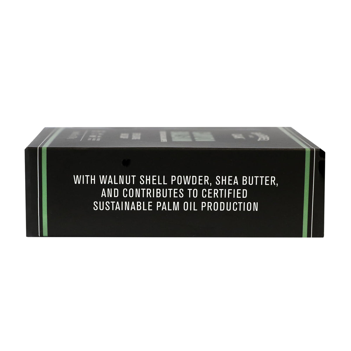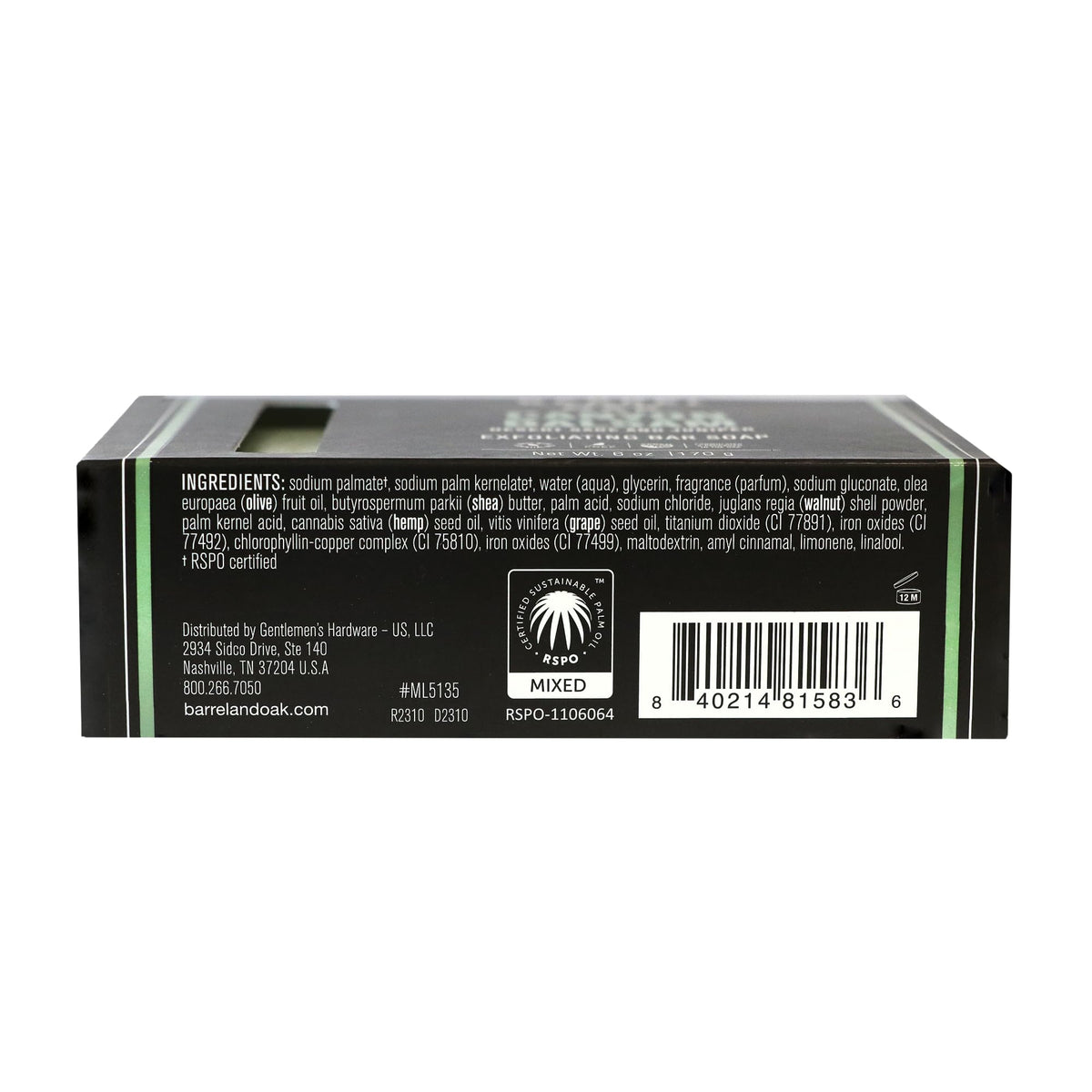 Barrel & Oak Exfoliating Bar Soap is a men's soap bar that deeply cleans pores, removes dead skin cells, and promotes skin renewal, crafted with sustainable palm oil, charcoal powder, and olive stone for a refreshing cleanse.