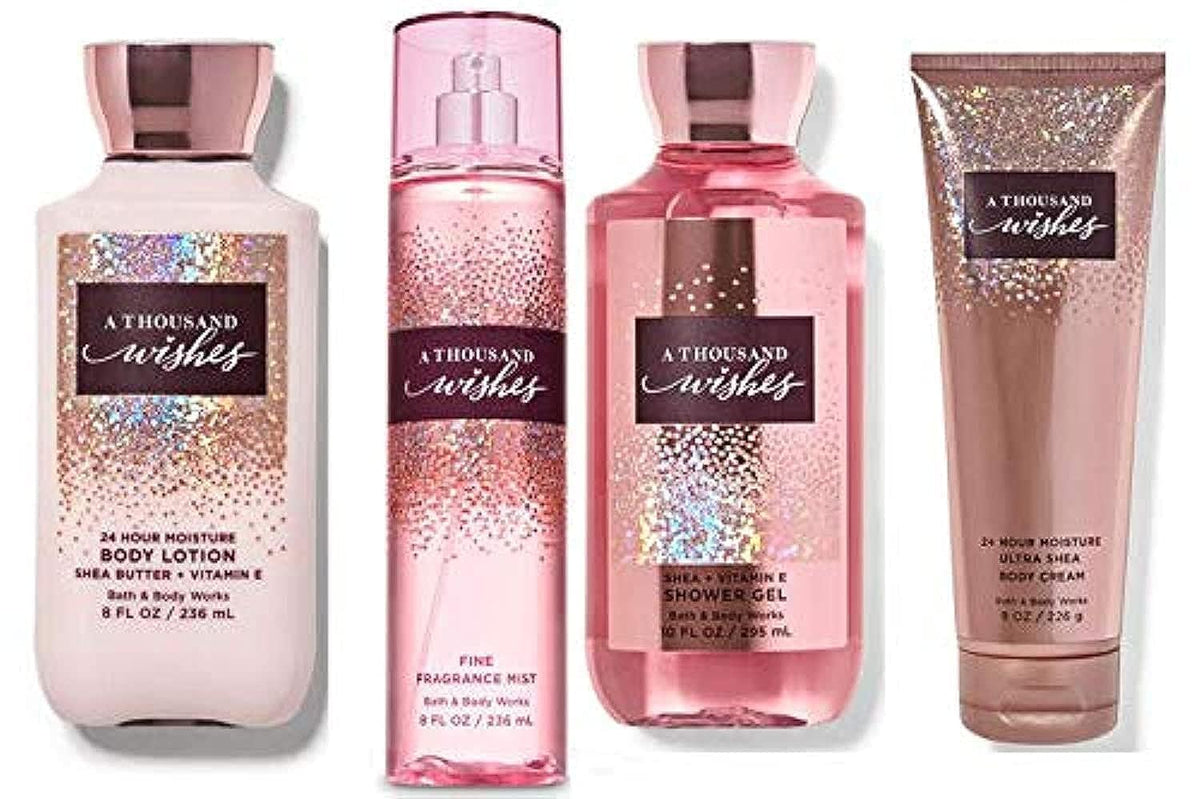 Indulge in luxury with the Bath & Body Works A Thousand Wishes Gift Set. This complete set includes a Body Lotion, Shower Gel, Body Cream, and Fine Fragrance Mist to pamper your skin and senses.