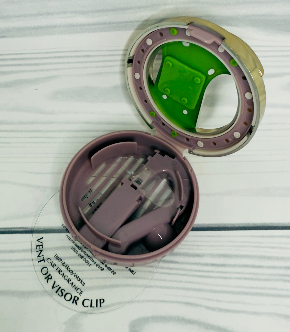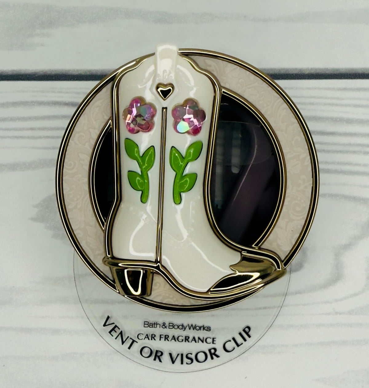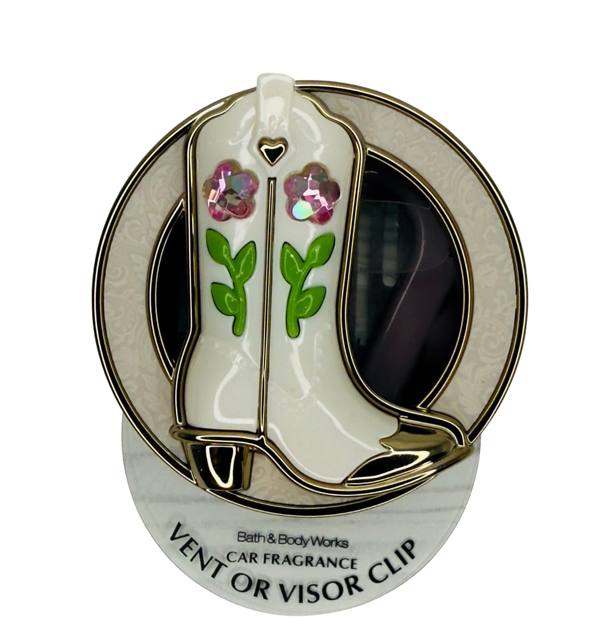 Add a touch of charm to your car with the Bath and Body Works Cowgirl Boot Car Visor Fragrance Holder. This white holder adorned with pink flowers and green leaves, accented with gold trim, adds a whimsical and fragrant touch to your vehicle.
