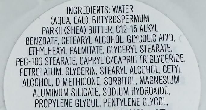 Ingredients: Water Aqua, Eau, Butyrospermum Parkii Shea Butter, C1215 Alkyl Benzoate, Cetearyl Alcohol, Glycolic Acid, Ethylhexyl Palmitate, Glyceryl Stearate, PEG100 Stearate, CaprylicCapric Triglyceride, Petrolatum, Glycerin, Stearyl Alcohol, Cetyl Alcohol, Dimethicone, Sorbitol, Magnesium Aluminum Silicate, Sodium Hydroxide, Propylene Glycol, Pentylene Glycol, Sorbitan Stearate, Phenoxyethanol, Fragrance Parfum, Polysorbate 80, Tridecyl Trimellitate, Paraffin, Palmitic Acid, Stearic Acid, Xanthan Gum, Tocopheryl Acetate, Menthol, Disodium EDTA.
