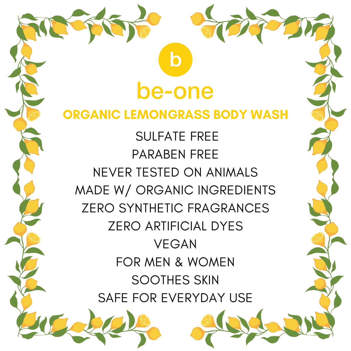 BE-ONE ORGANICS Certified Organic Lemongrass Body Wash Body Wash - Paraben & Sulfate Free - All Natural - Eczema - Sensitive Skin - Vegan - Gentle - For Men & Women - MADE IN USA