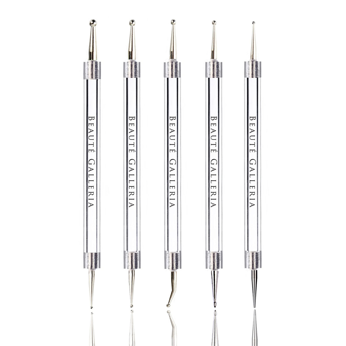Beaute Galleria 5 Piece 2-Way Dotting Pens Nail Art Design Set offers versatile tools for manicures. Create intricate nail designs with ease using these dotting and swirling tools.
