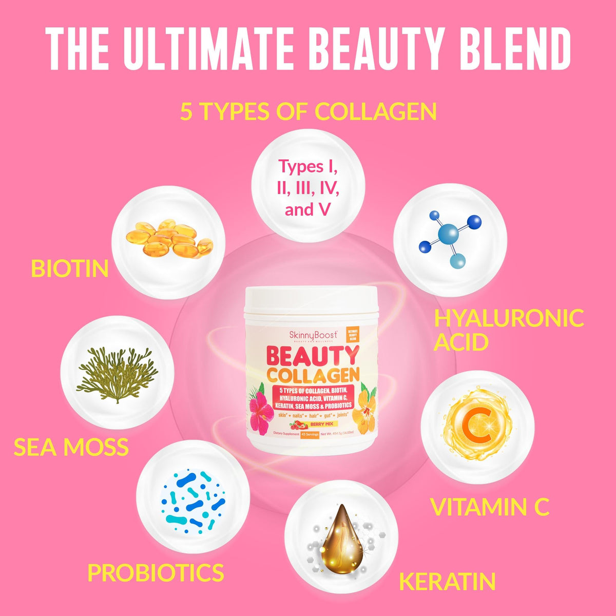 Beauty Collagen-Berry Mix Flavored-Ultimate Beauty Blend with 5 Types of Collagen, Sea Moss, Biotin, Keratin, Hyaluronic Acid, Vitamin C and Probiotics-All Natural, Made in USA -45 Servings