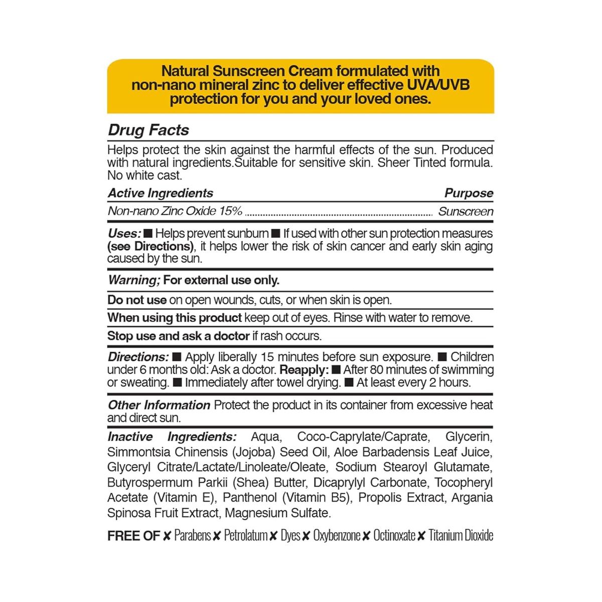 Ingredients: Non nano Zinc Oxide, Aqua, Caprylic Capric Triglyceride, Coco Caprylate Caprate,Aloe Barbadensis Leaf Juice,Polyglyceryl2 Dipolyhydroxystearate,Silica,Butyrospermum Parkii Shea Butter,,Simmondsia Chinensis Jojoba Seed Oil,Polyglyceryl3 Diisostearate,,Polyglyceryl4 Diisostearate,Panthenol,Magnesium Sulfate,Cera Alba,Polyhydroxystearic Acid,Polyglyceryl3 Oleate,Propolis Extract,Diisostearoyl Polyglyceryl3 Dimer Dilinoleate,Tocopheryl Acetate,Xylityl Sesquicaprylate,Xanthan Gum, Parfum Argan oil