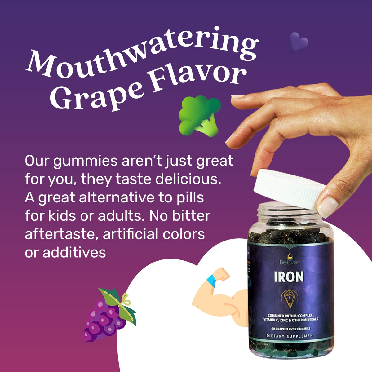 BeLive Iron Gummies are a delicious multivitamin supplement packed with essential nutrients. These grape-flavored gummies support blood oxygen levels and overall growth and development for women, men, and kids.