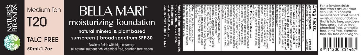 Bella Mari Moisturizing Foundation Talc Free Medium Tan T20 50ml/ 1.7oz Jar