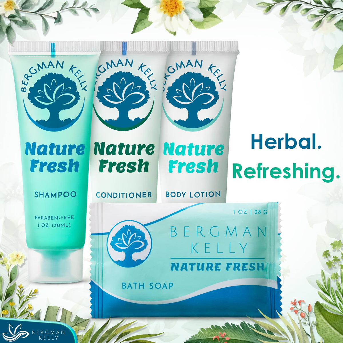 Bergman Kelly Hotel Toiletries Bundle (Nature Fresh, 1 oz each, 100 Pieces) 4-Piece Set: 25 Rectangular Bar Soap, 25 Shampoo, 25 Conditioner & 25 Body Lotion - Bulk Mini Guest Amenities