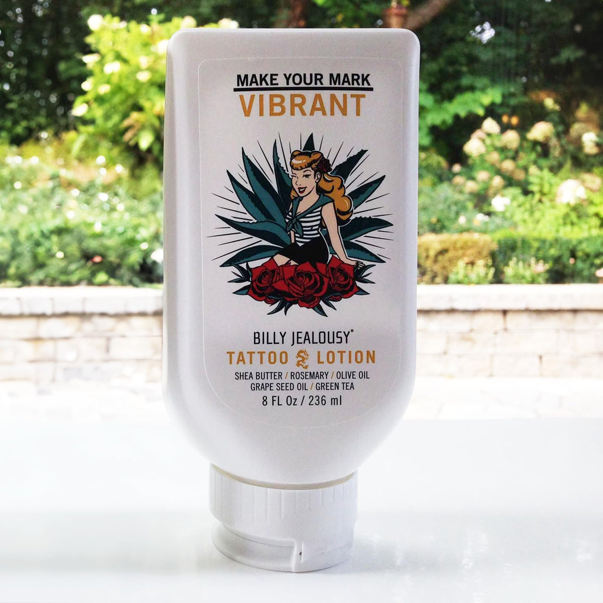 Billy Jealousy Tattoo Lotion is a must-have for tattoo care. This 8 fl. oz. lotion helps maintain tattoo vibrancy and skin health.