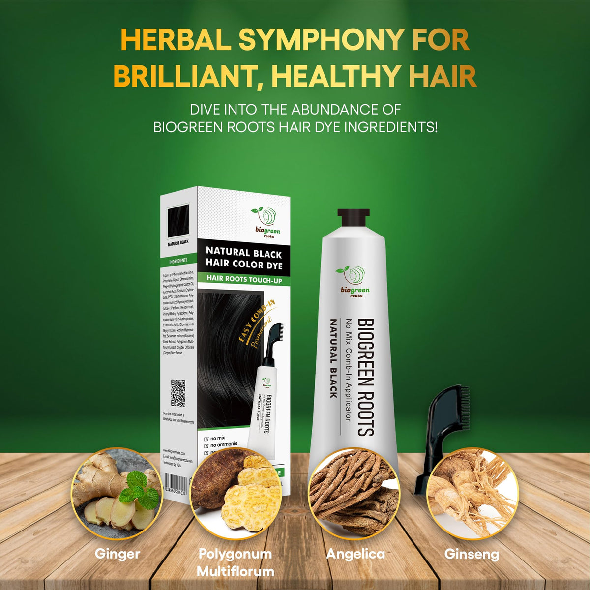 Nourish your hair with Biogreen Roots Ammonia-Free Herbal Hair Shampoo in Natural Black. This herbal shampoo effectively covers gray hair, providing natural color and nourishment without staining the skin, suitable for both men and women.