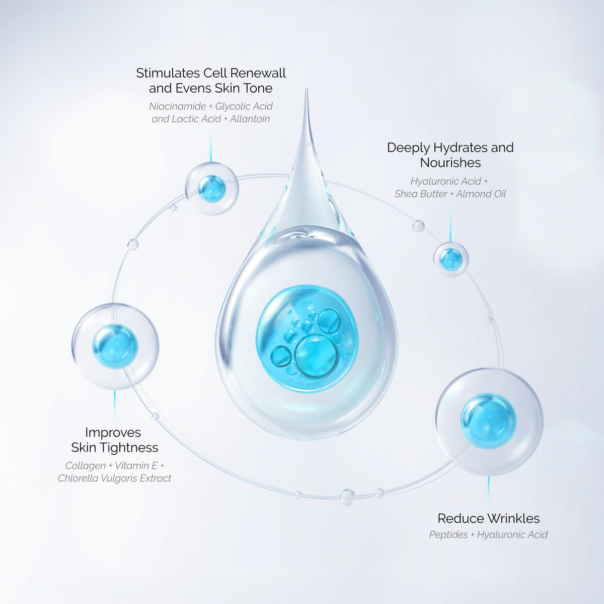 Ingredients :: Water, Niacinamide, Squalene, Steareth-2, Shea Butter, Caprylic/Capric Triglyceride, Glycerin,, Almond Oil, Cetearyl Isononanoate, Propanediol, Steareth-21, Cetyl Alcohol, Stearyl Alcohol,, Hydrogenated Polyisobutene, Benzyl Alcohol, Tocopheryl Acetate, Phenoxyethanol, Dimethicone, Allyl Methacrylates Crosspolymer, Carbomer, Silica Dimethyl Silylate, Xanthan Gum,, Allantoin, Sodium Citrate, Polyacrylamide, C13-14 Isoparaffin, Ethylhexylglycerin, Disodium EDTA, Triethanolamine, BHT,, Jujuba Seed Extract, Laureth-7, Soluble Collagen, Chlorella Extract, Sodium Benzoate, Sodium Hyaluronate, Phytocosteroids, Potassium Sorbate, Glycolic Acid/Lactic Acid Copolymer, Palmitoyl Sh-Octapeptide-24 Amide, Polyvinyl Alcohol, Citric Acid, Palmitoyl Sh-Tripeptide-5 Norisoleucyl Sh-Nonapeptide-1.