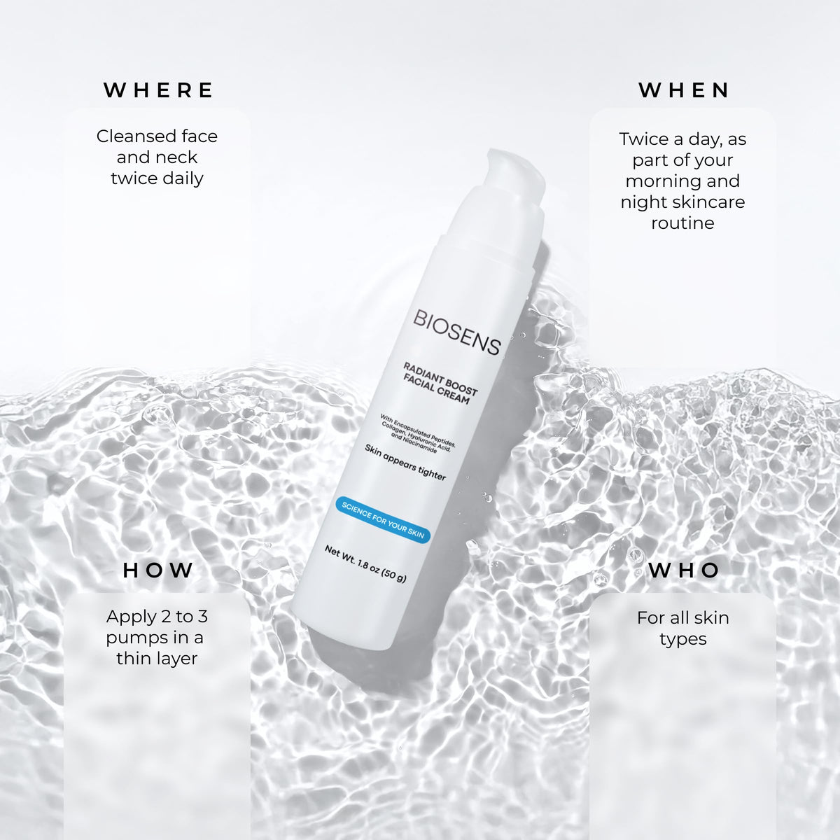 Experience the anti-aging benefits of BIOSENS Antiaging Cream Moisturizer. This formula reduces wrinkles and fine lines, boosts collagen production, and contains peptides, collagen, niacinamide, and vitamin E in a 1.8 fl oz airless pump.