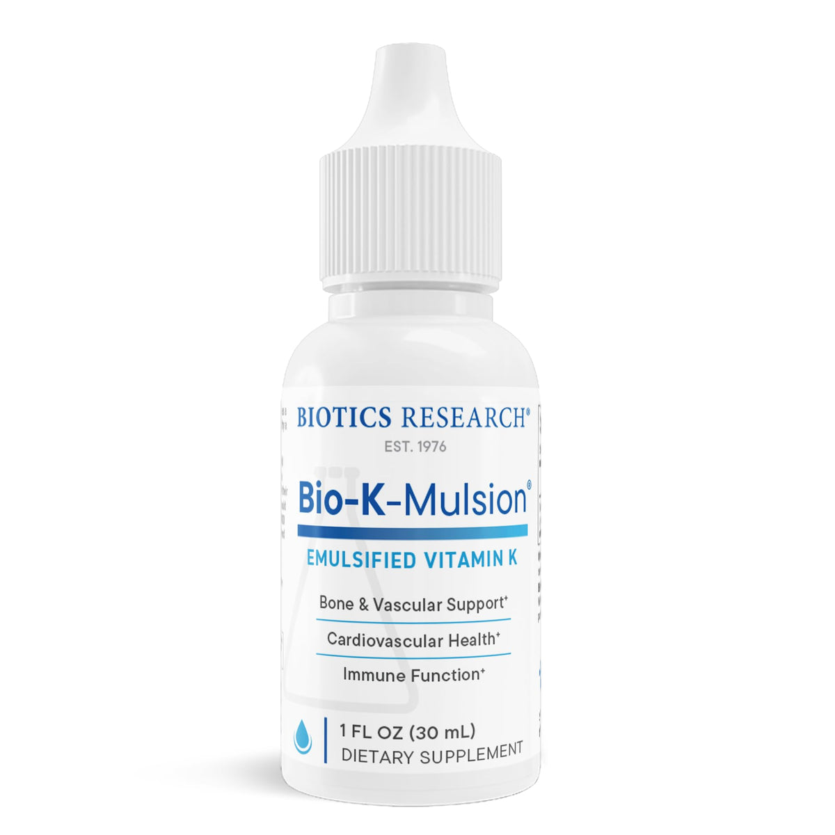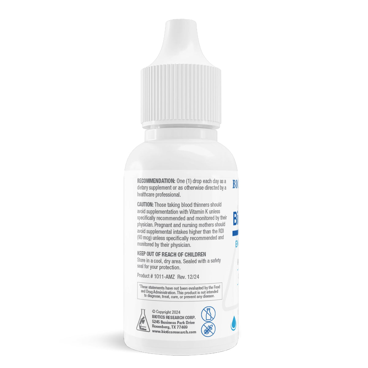 Biotics Research Bio K Mulsion Liquid Vitamin K Drops support bone and heart health. With 500 mcg of Vitamin K1, it aids in blood clotting and overall well-being.