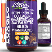 Revitalize your hair, skin, and nails with Biotin Liquid Drops by Clean Nutra. This powerful formula contains Collagen, Keratin, Hyaluronic Acid, Saw Palmetto, Silica, Vitamin A, C, D, Bamboo, Turmeric, Zinc, Folate, Magnesium, and Horsetail for comprehensive beauty support.