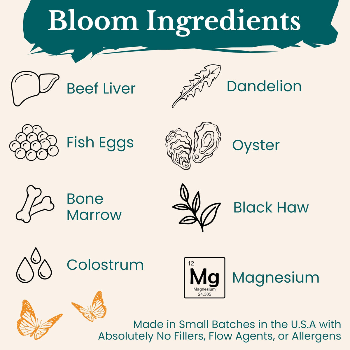 Ingredients: Liver, Fish Eggs, Colostrum, Bone Marrow, Vitamin E, Dandelion Root, Black Haw, Raspberry Leaf, Ginger Root