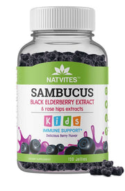 Black Sambucus Elderberry Gummies for Kids provide immune support with vitamin C and D3. They are vegetarian, non-GMO, gluten-free, nut and dairy-free gummies in a pack of 120.