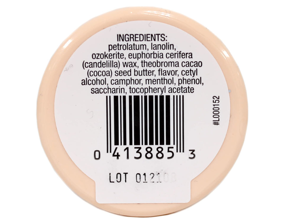 Ingredients :: Petrolatum, lanolin, ozokerite, euphorbia cerifera (candelilla) wax, theobroma cacao (Cocoa) seed butter, flavor, cetyl alcohol, camphor, menthol, phenol, saccharin, tocopheryl acetate.
