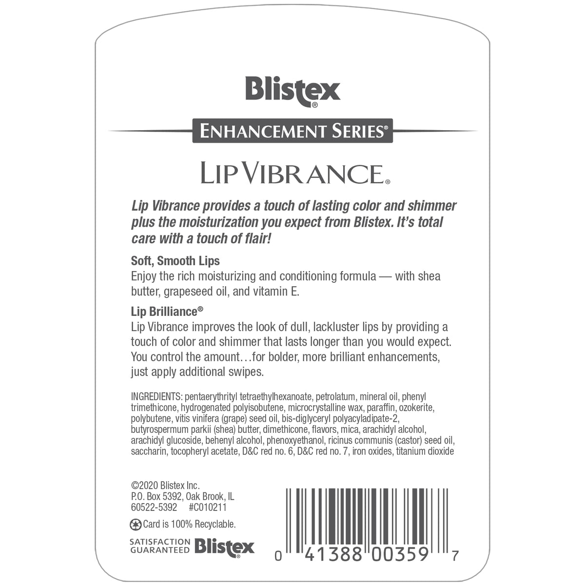 Ingredients :: Active Ingredients: Dimethicone (2.0%) (w/w), Octinoxate (7.5%) (w/w), Oxybenzone (2.5%) (w/w). Purpose: Lip Protectant; Sunscreen; Sunscreen. Inactive Ingredients: Arachidyl Alcohol, Arachidyl Glucoside, Behenyl Alcohol, Bis-Diglyceryl Polyacyladipate-2, Butylene Glycol, Butyrospermum Parkii (Shea Butter), D&C Red 6, D&C Red 7, Ethylhexyl Palmitate, Flavors, Hydrogenated Polyisobutene, Iron Oxides, Isostearoyl Hydrolyzed Silk, Mica, Microcrystalline Wax, Mineral Oil, Ozokerite, Panthenyl Ethyl Ether, Paraffin, Pentaerythrityl Tetraethylhexanoate, Petrolatum, Phenoxyethanol, Phenyl Trimethicone, Polybutene, Polyethylene, PPG-5-Ceteth-20, Ricinus Communis (Castor) Seed Oil, Saccharin, Silica Dimethyl Silylate, Sodium Hyaluronate, Titanium Dioxide, Tocopheryl Acetate, Vitis Vinifera (Grape) Seed Oil.