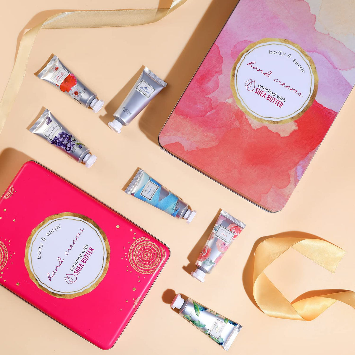 BODY & EARTH Hand Cream Gift Set is a collection of 12 travel-size hand creams enriched with shea butter, perfect for moisturizing dry hands on the go and making them feel soft and nourished.