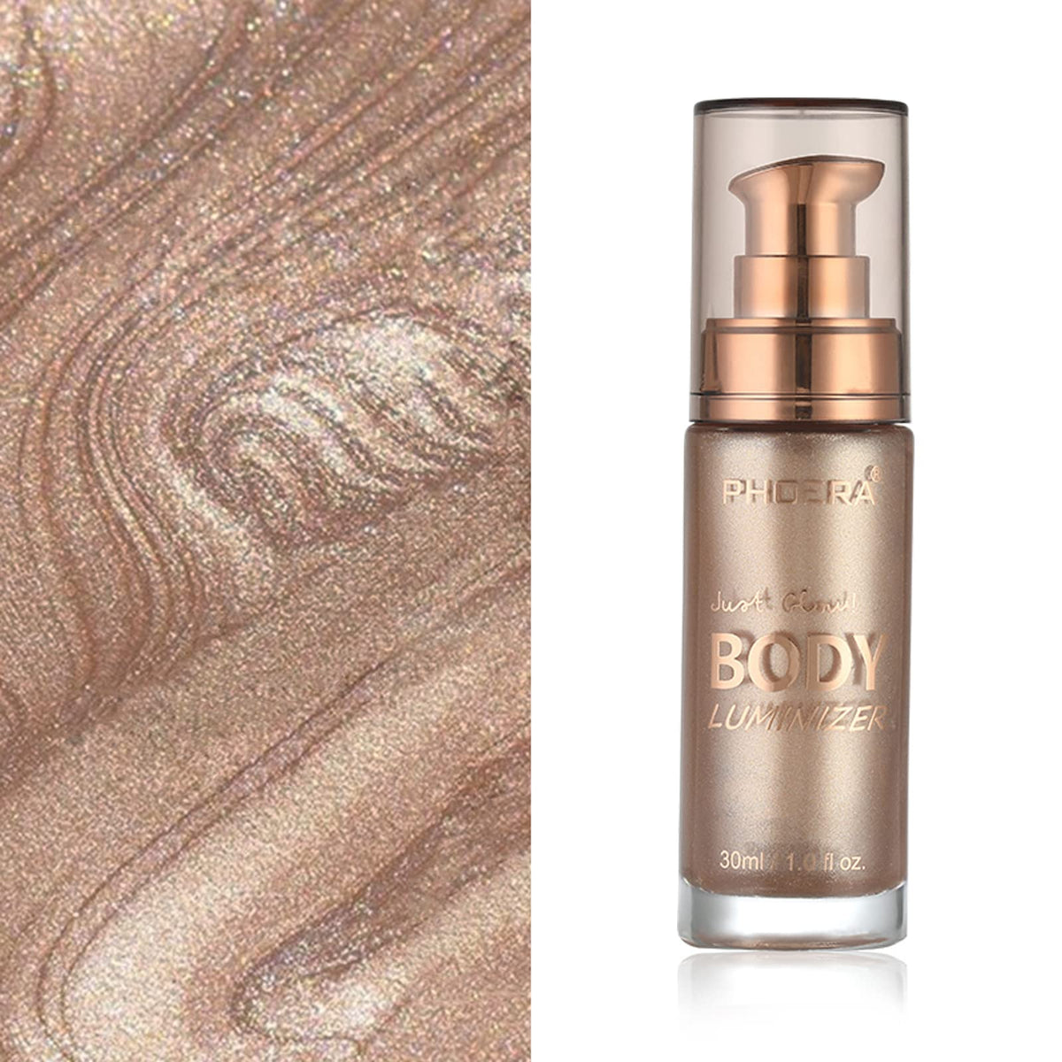 Body Shimmer Oil, Rose Gold Natural Glow Luminizer, Long Lasting Waterproof Moisturizing Liquid Illuminator Highlighter Makeup for a Sun-Kissed Glow, Brush Include, 1oz, Light Medium
