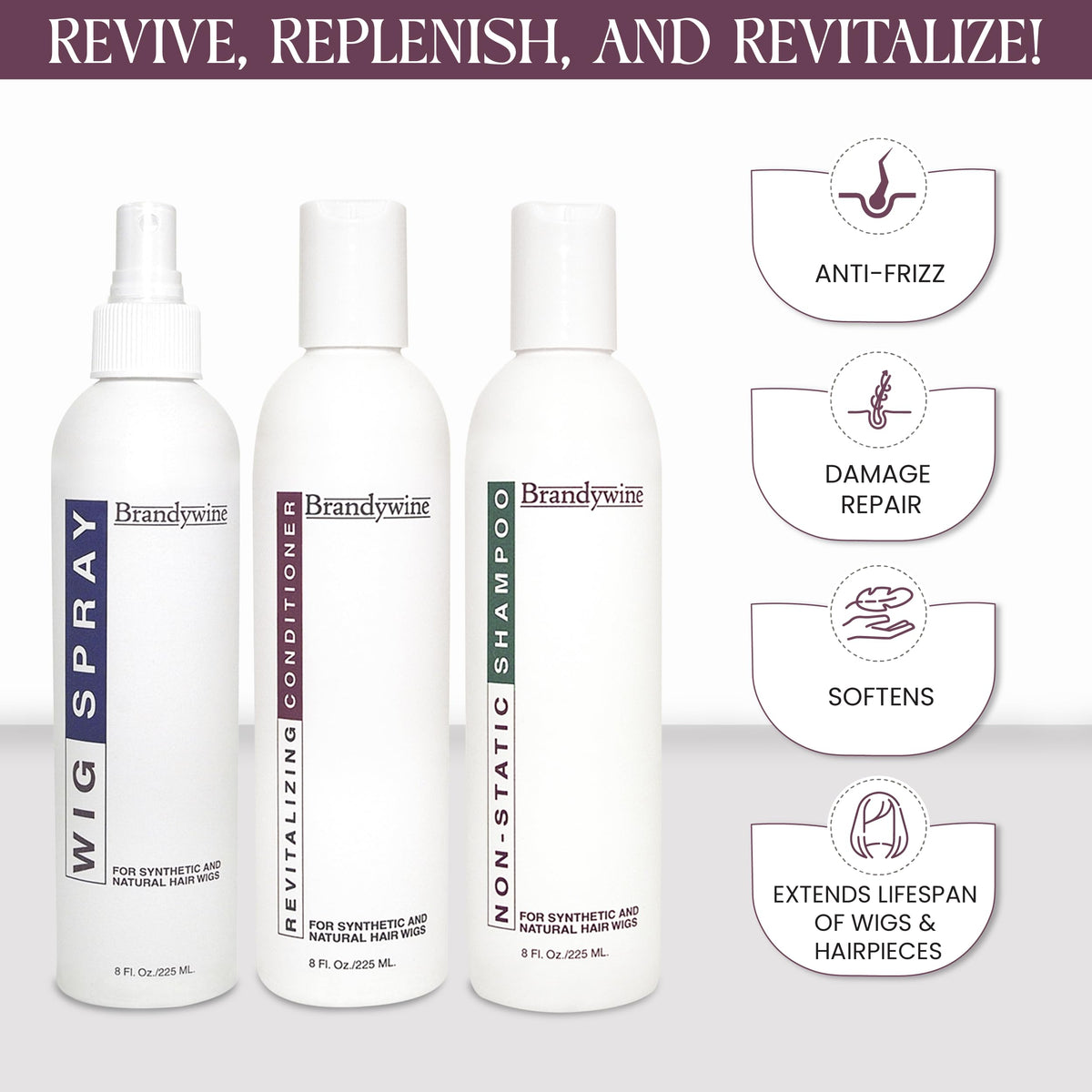 Brandywine Maintenance Kit, Non Static Shampoo, Revitalizing Conditioner & Wig Spray 8 Oz. Each