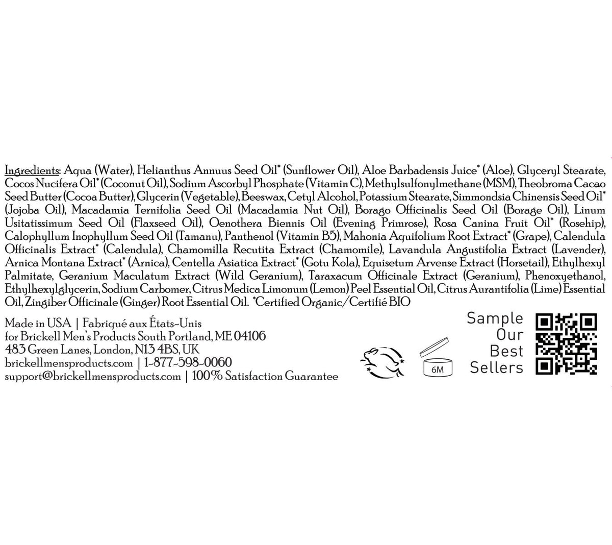 Ingredients: Aqua Water, Helianthus Annuus Seed Oil Sunflower Oil, Aloe Barbadensis Juice Aloe, Glyceryl Stearate, Cocos Nucifera Oil Coconut Oil, Sodium Ascorbyl Phosphate Vitamin C, Methylsulfonylmethane MSM, Theobroma Cacao Seed Butter Cocoa Butter, Glycerin Vegetable, Beeswax, Cetyl Alcohol, Potassium Stearate, Simmondsia Chinensis Seed Oil Jojoba Oil, Macadamia Ternifolia Seed Oil Macadamia Nut Oil, Borago Officinalis Seed Oil Borage Oil, Linum Usitatissimum Seed Oil Flaxseed Oil, Oenothera Biennis Oil Evening Primrose, Rosa Canina Fruit Oil Rosehip, Calophyllum Inophyllum Seed Oil Tamanu, Panthenol Vitamin B5, Mahonia Aquifolium Root Extract Grape, Calendula Officinalis Extract Calendula, Chamomilla Recutita Extract Chamomile, Lavandula Angustifolia Extract Lavender, Arnica Montana Extract Arnica, Centella Asiatica Extract Gotu Kola, Equisetum Arvense Extract Horsetail, Ethylhexyl Palmitate, Geranium Maculatum Extract Wild Geranium, Taraxacum Officinale Extract Geranium, Phenoxyethanol, Ethylhexylglycerin, Sodium Carbomer, Citrus Medica Limonum Lemon Peel Essential Oil, Citrus Aurantifolia Lime Essential Oil, Zingiber Officinale Ginger Root Essential Oil.