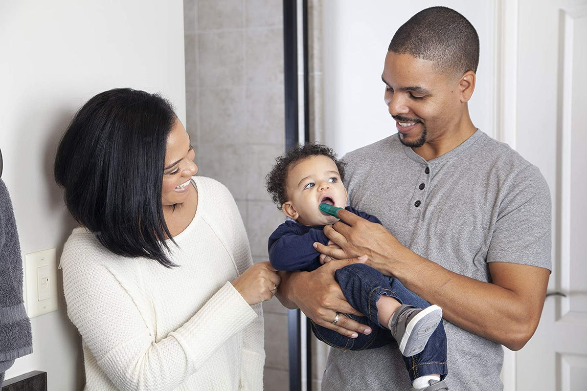 Place the toothbrush over the adults index finger, wet it and gently brush massage your babys gums and teeth. The toothbrush must fit snugly onto the fingertipto make sure that it will not come off during use.