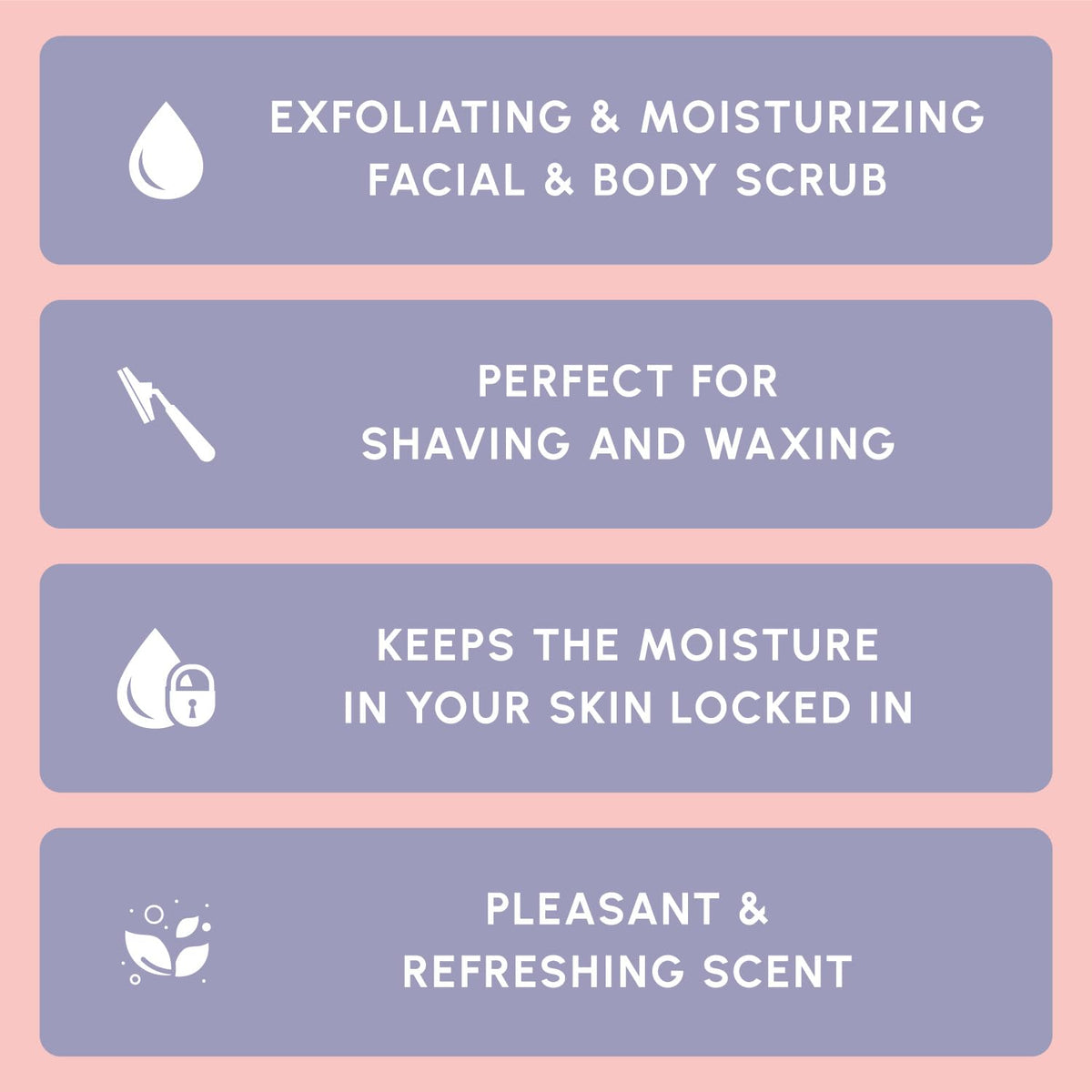 Apply the scrub on wet skin in the shower or bath for gentle exfoliation and hydration