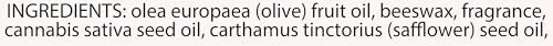 Ingredients :: olea eupoaea (olive) fruit oil, beeswax, fragrance, cannabis sativa seed oil, carthamus tinctorius (safflower) seed oil, aloe barbadensis leaf extract, pyrus communis (pear) fruit extract, coumarin, hexyl cinnamal, hydroxycitronellal, limonene