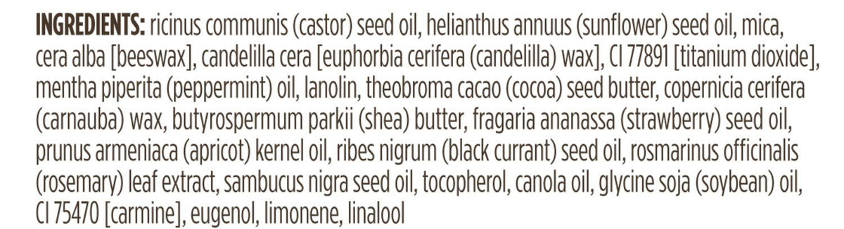 Ingredients: Ricinus communis castor seed oil, helianthus annuus sunflower seed oil, beeswax, euphorbia cerifera wax, mentha piperita peppermint oil, lanolin, theobroma cacao cocoa seed butter, copernicia cerifera wax, butyrospermum parkii shea butter, fragaria ananassa strawberry seed oil, prunus armeniaca apricot kernel oil, ribes nigrum black currant seed oil, rosmarinus officinalis rosemary leaf extract, sambucus nigra elderberry seed oil, tocopherol, canola oil, glycine soja soybean oil, tin oxide, may contain mica, iron oxides, carmine, alumina, titanium dioxide.