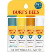 - MOISTURIZING LIP BALM: Four 0.15 oz. lip balm tubes of Burt's Bees Rescue Balm, with one tube each of Cooling Eucalyptus, Lemon, Honey and Unscented lip balm