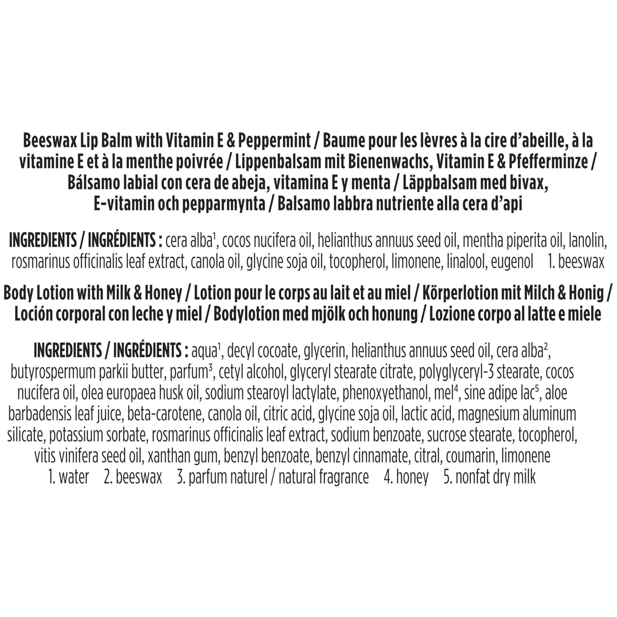 Ingredients: Lip Balm cera alba1, cocos nucifera oil, helianthus annuus seed oil, mentha piperita oil, lanolin, tocopherol, rosmarinus officinalis leaf extract, glycine soja oil, canola oil, limonene, linalool, eugenol 1. beeswax Body Lotion aqua1, glycerin, decyl cocoate, butyrospermum parkii butter, cera alba2, parfum3, helianthus annuus seed oil, cocos nucifera oil, glyceryl stearate citrate, cetyl alcohol, olea europaea fruit oil, polyglyceryl3 stearate, sodium stearoyl lactylate, sine adipe lac4, mel5, hydrolyzed jojoba esters, canola oil, rosmarinus ox001Dcinalis leaf extract, xanthan gum, lactic acid, jojoba esters, tocopherol, glycine soja oil, betacarotene, potassium sorbate, phenoxyethanol, benzyl benzoate, benzyl cinnamate, citral, coumarin, limonene 1. water 2. beeswax 3. parfum naturel natural fragrance 4. nonfat dry milk 5. honey