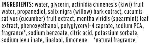 Ingredients: water, glycerin, actinidia chinenesis kiwi fruit water, propanediol, salix nigra willow bark extract, cucumis sativus cucumber fruit extract, mentha viridis spearmint leaf extract, phenoxyethanol, polyglyceryl4 caprate, sodium PCA, fragrance, sodium benzoate, citric acid, potassium sorbate, sodium levulinate, linalool, limonene natural fragrance