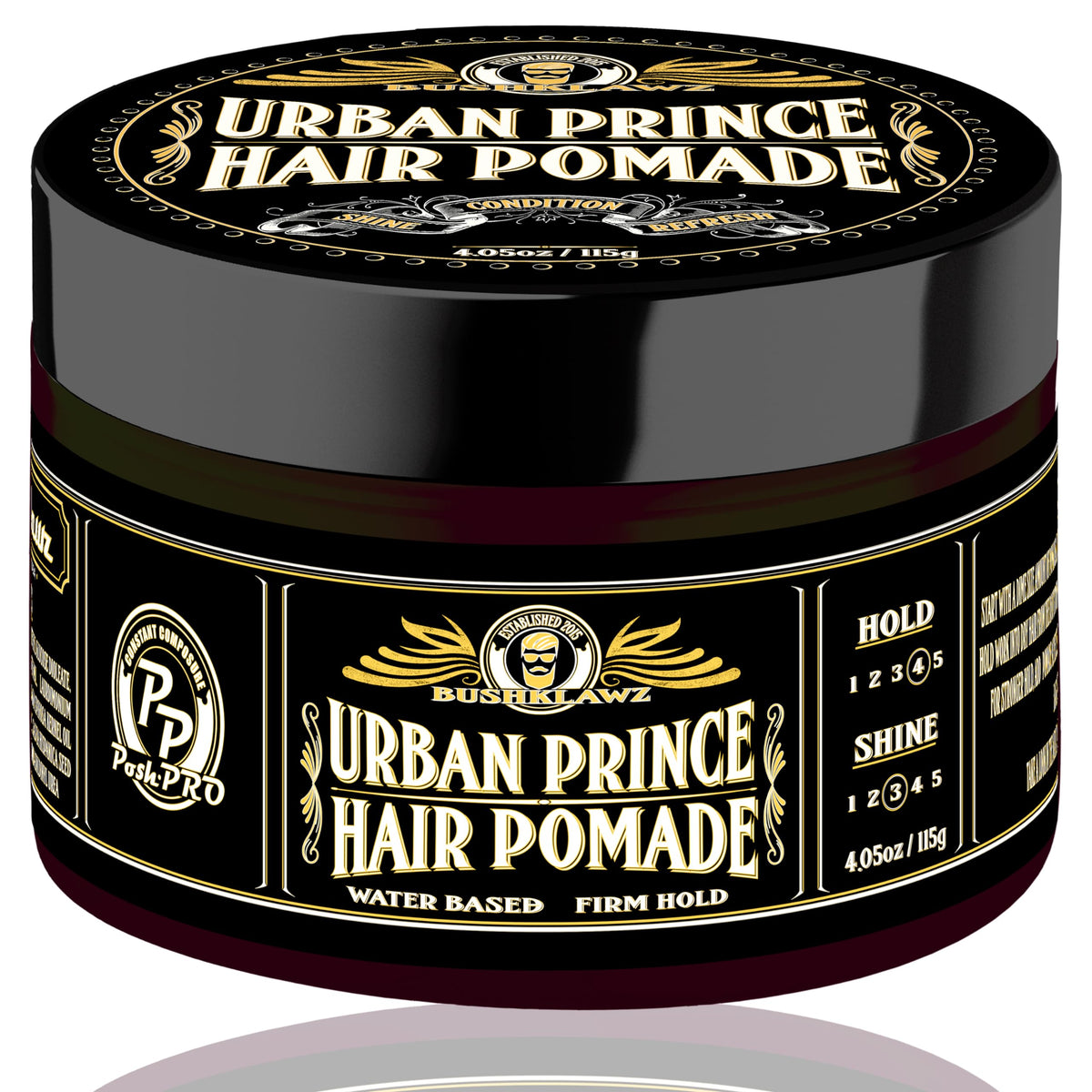 BushKlawz Urban Prince Hair Pomade offers a firm hold with easy washability, perfect for creating sleek and stylish hairstyles that last all day.