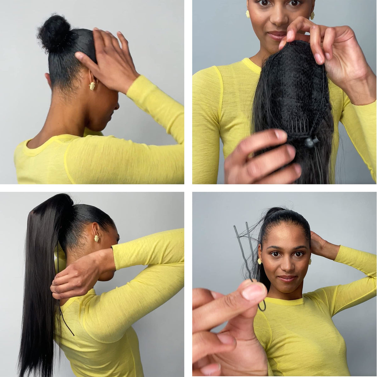 Attach the wig to your hair using the elastic drawstring and two small combs
