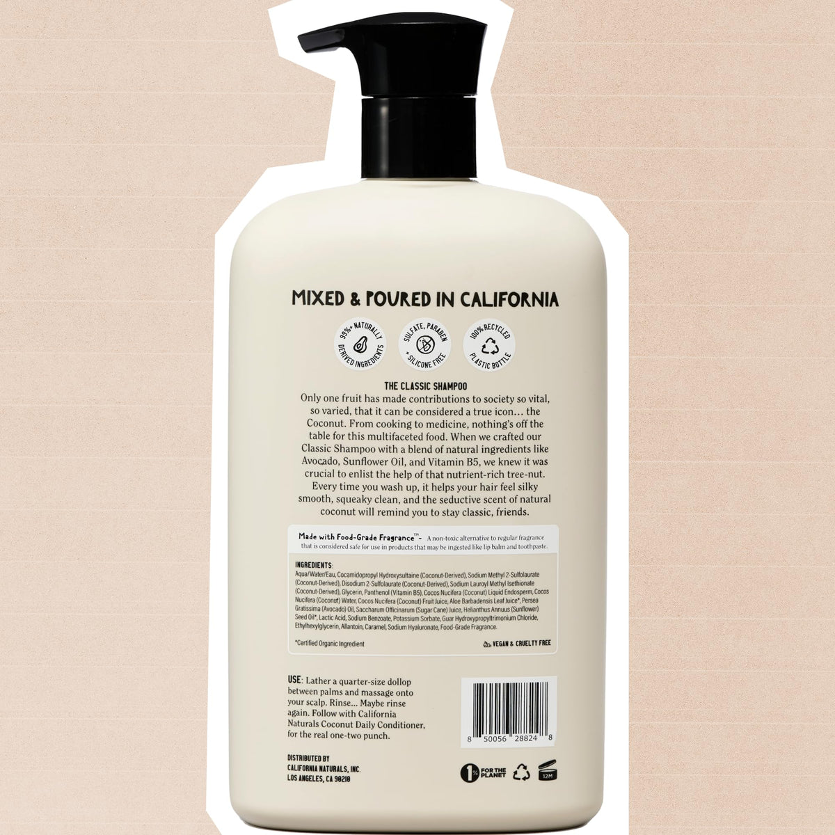 Pop open your bottle and youll be warmly met by our signature scent of tropical coconut. Close your eyes, lather the moisturizing shampoo into your hair, being sure to massage the foaming formula into your roots and ends, and let the woody, citrusy fragrance transport you to the Golden State.