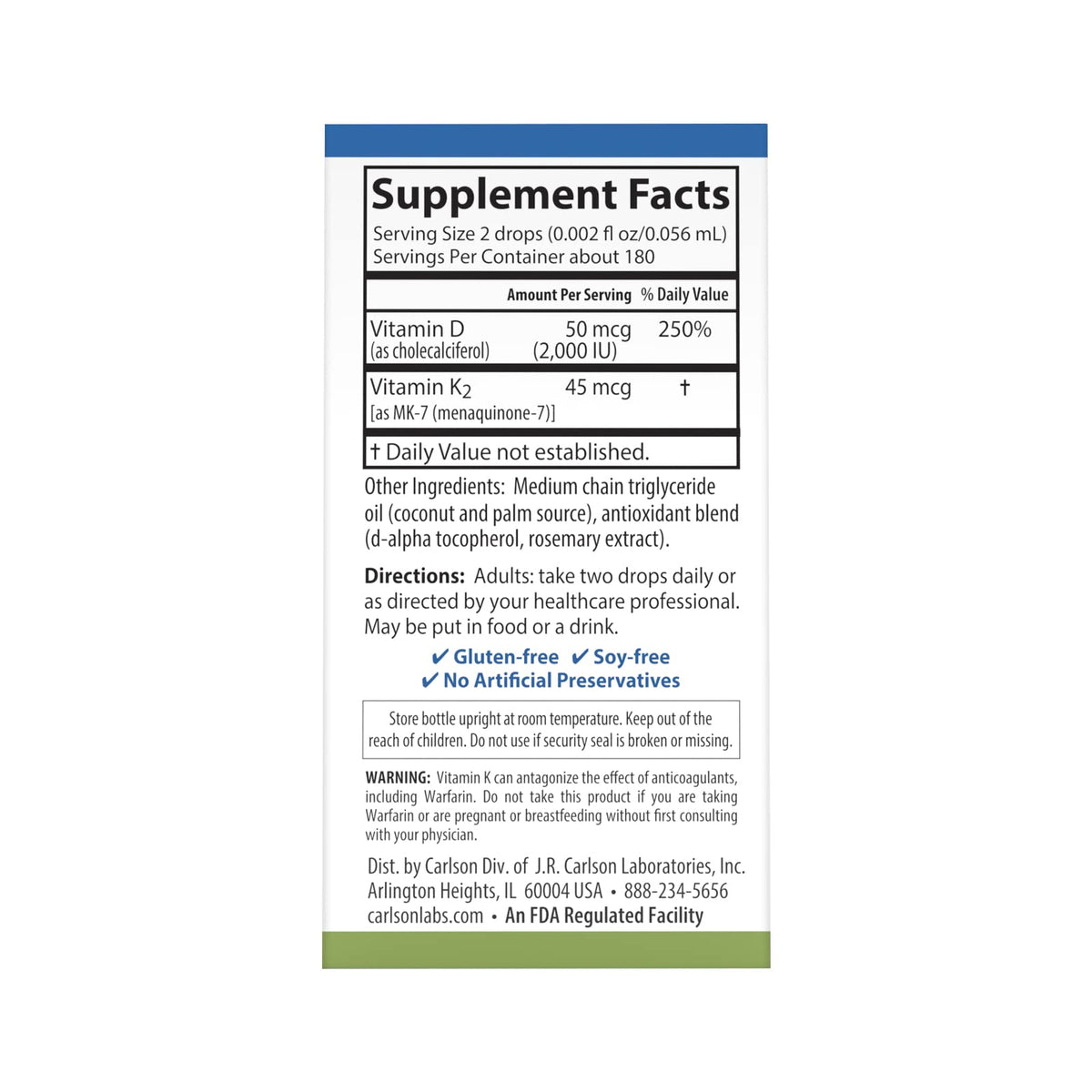 Carlson Super Daily D3 + K2, 50 mcg D3 + 45 mcg MK-7, Heart & Bone Health, 360 Liquid Drops, 10.16 ml