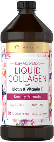 Carlyle Liquid Collagen in berry flavor combines biotin and amino acids for skin, hair, and overall health. This non-GMO and gluten-free formula in a 16 fl oz bottle provides essential nutrients.