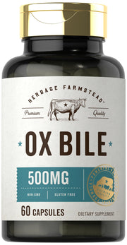 Support your digestive health with Carlyle Ox Bile Supplement. These 500 mg capsules contain digestive enzymes, ensuring a gluten-free and non-GMO formula by Herbage Farmstead, promoting overall wellness.