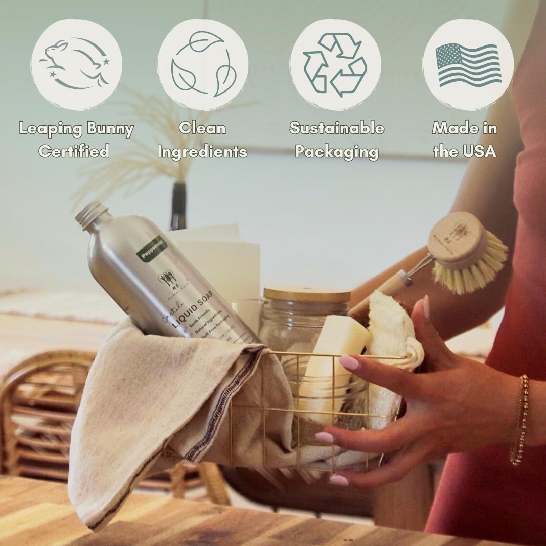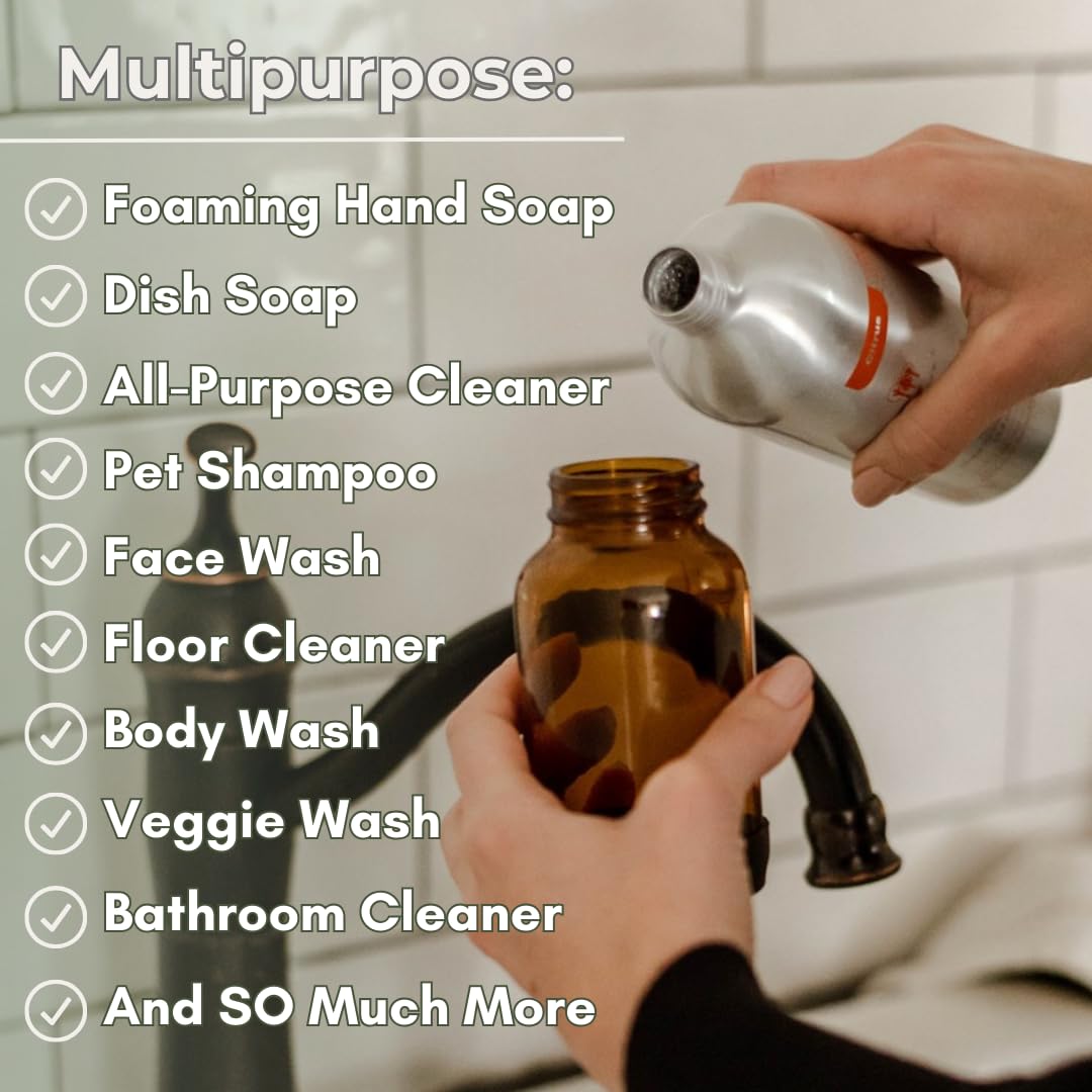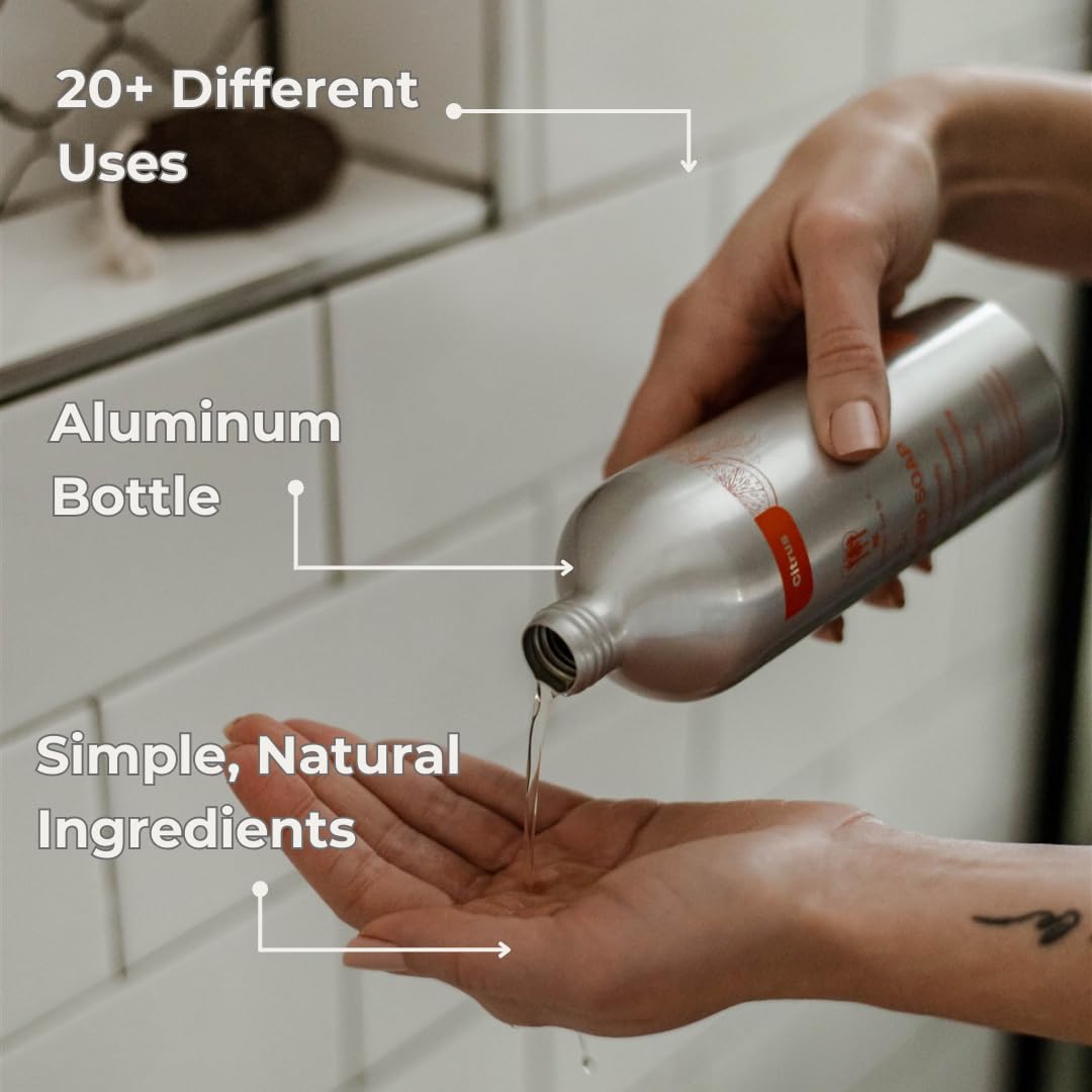 Experience the versatility of Castile Soap All-in-One Liquid Soap, a natural and biodegradable cleaner suitable for body, face, hair, and home use. This gentle citrus-scented soap is ideal for sensitive skin.
