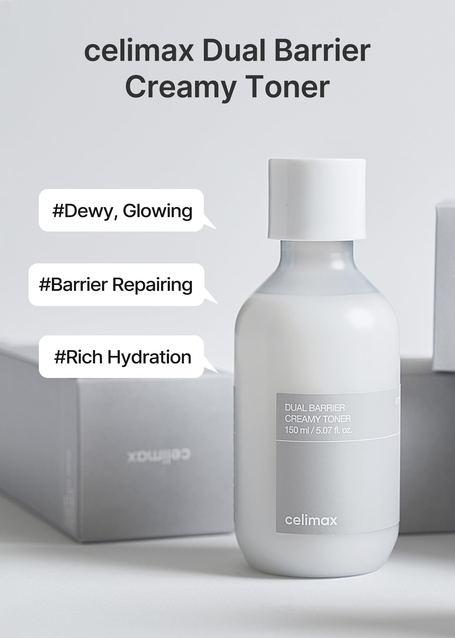 Nourish your skin with celimax Dual Barrier Creamy Toner. This alcohol-free toner enriched with ceramides, peptides, and soothing properties provides hydration and calming effects in a 150ml bottle.